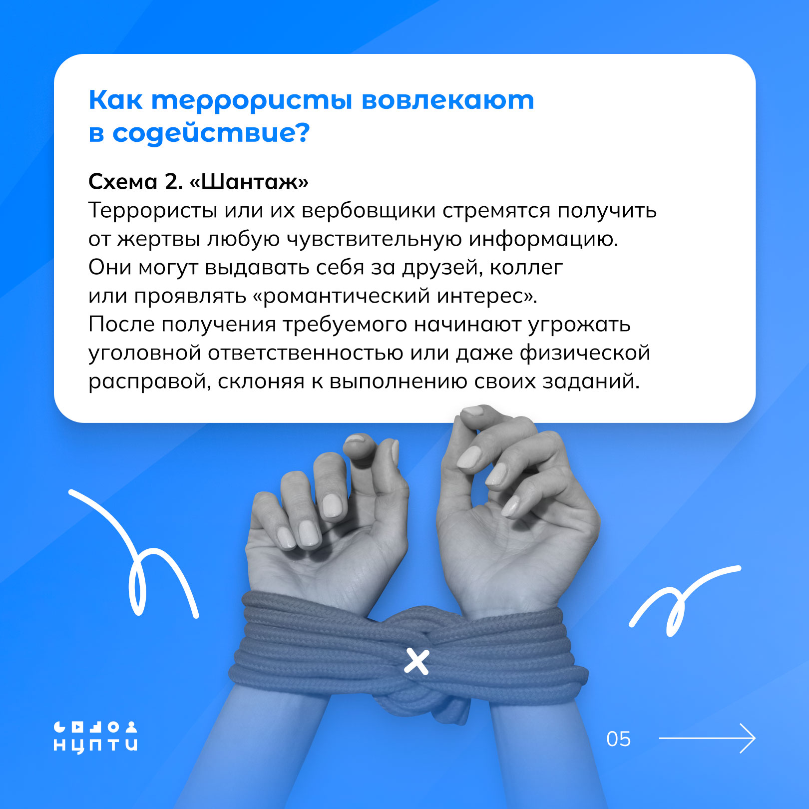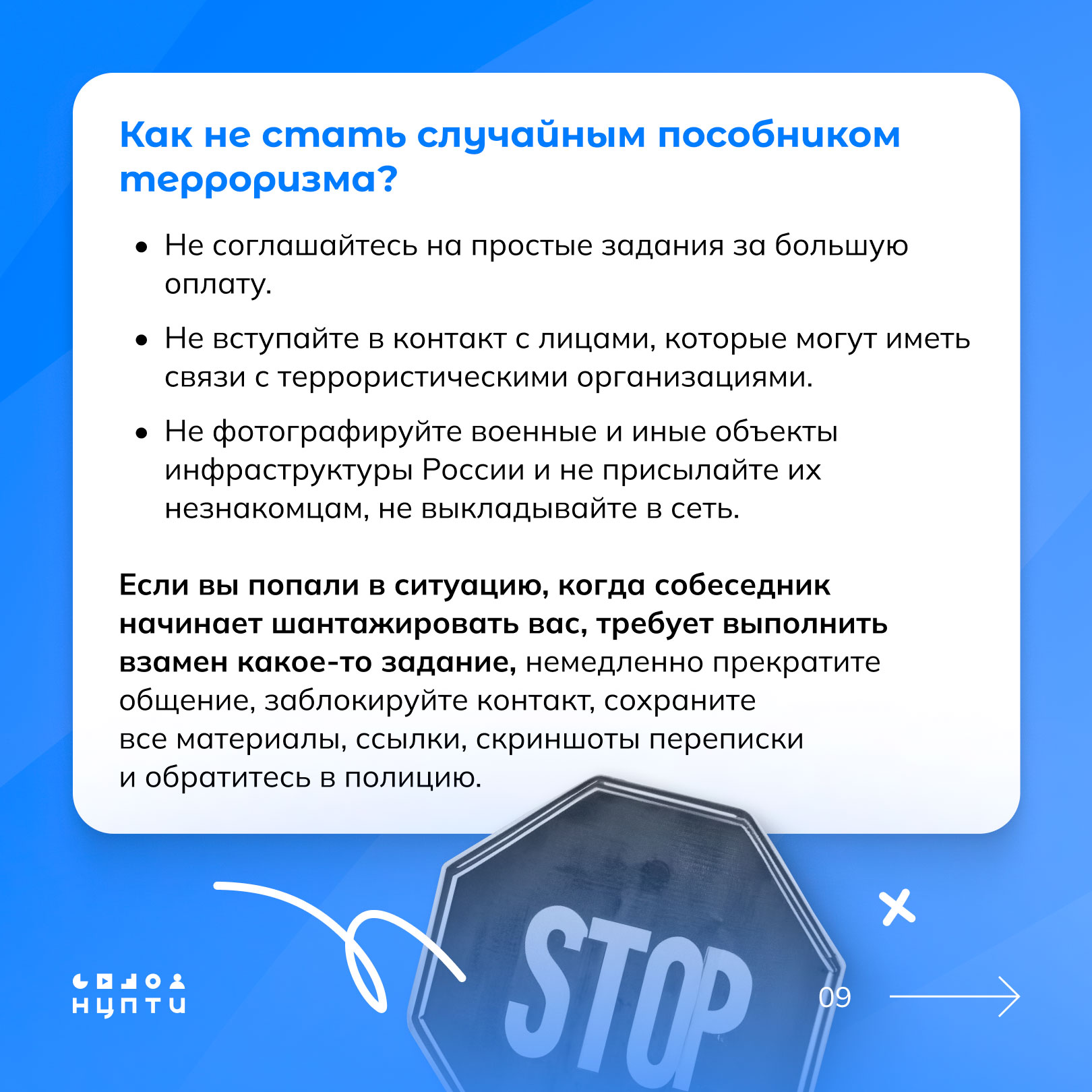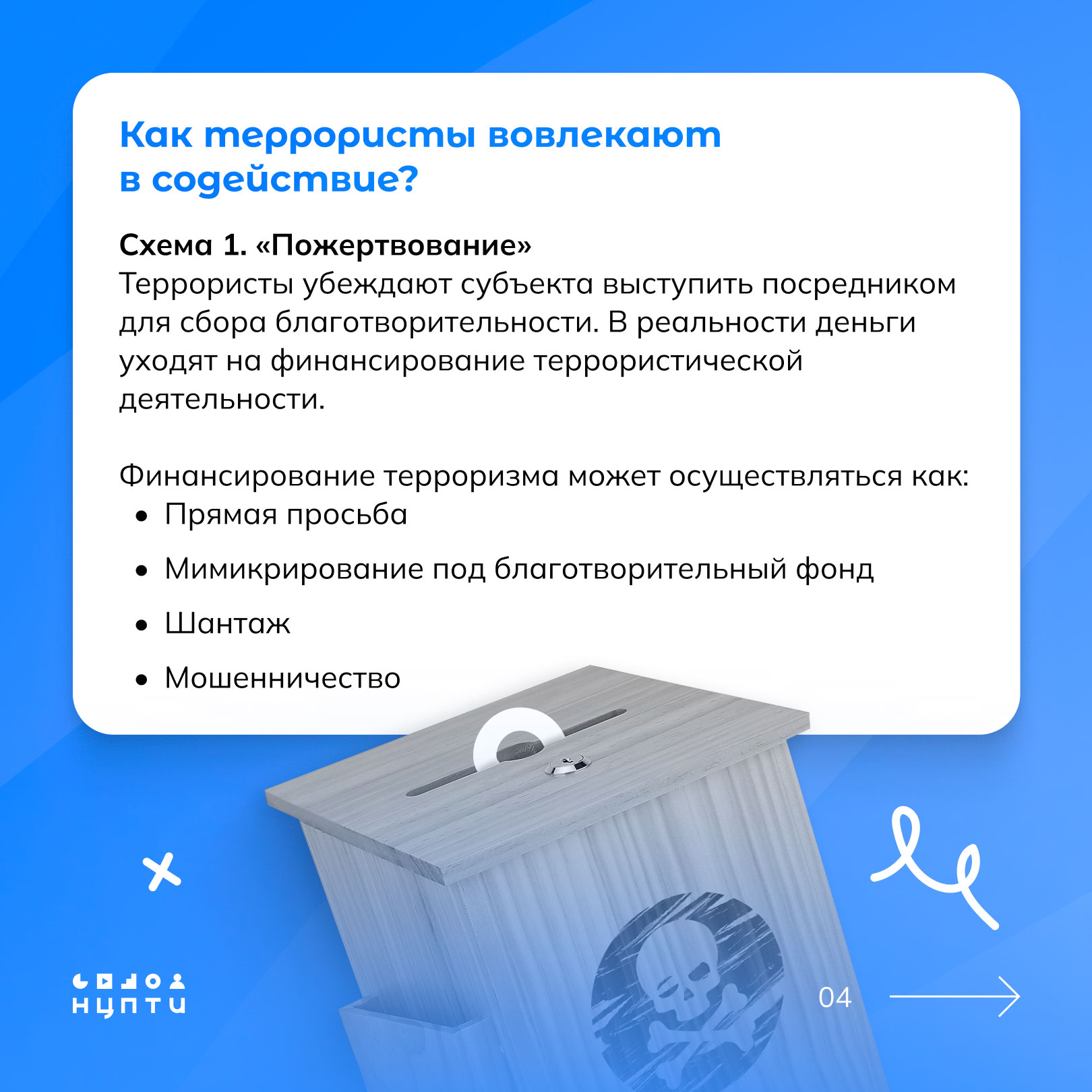 О том, что такое содействие терроризму и какие схемы при этом используются — в карточках, разработанных Национальным центром информационного противодействия терроризму и экстремизму в образовательной среде и сети Интернет (НЦПТИ).