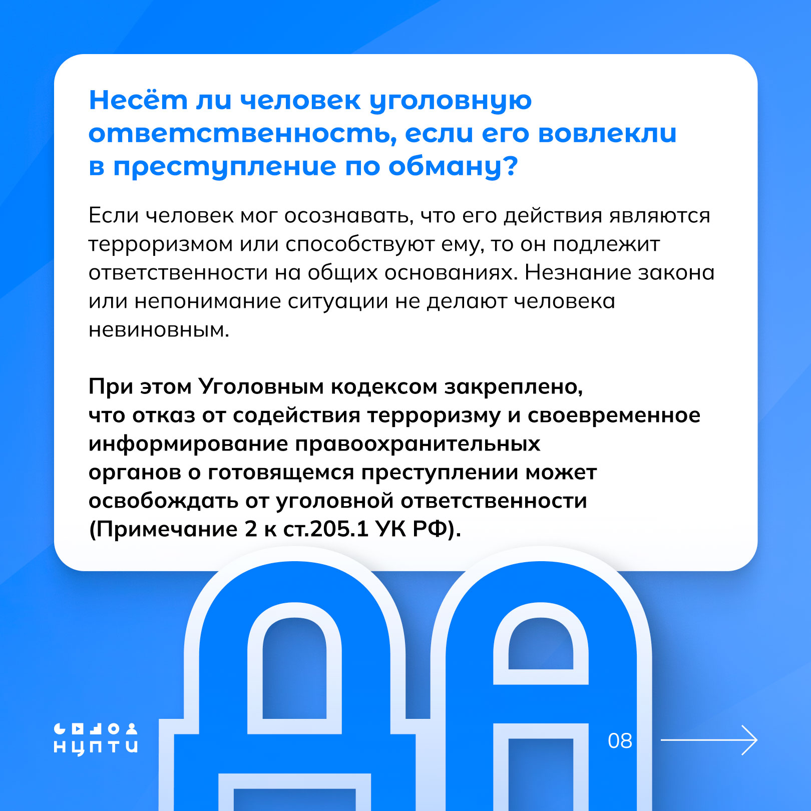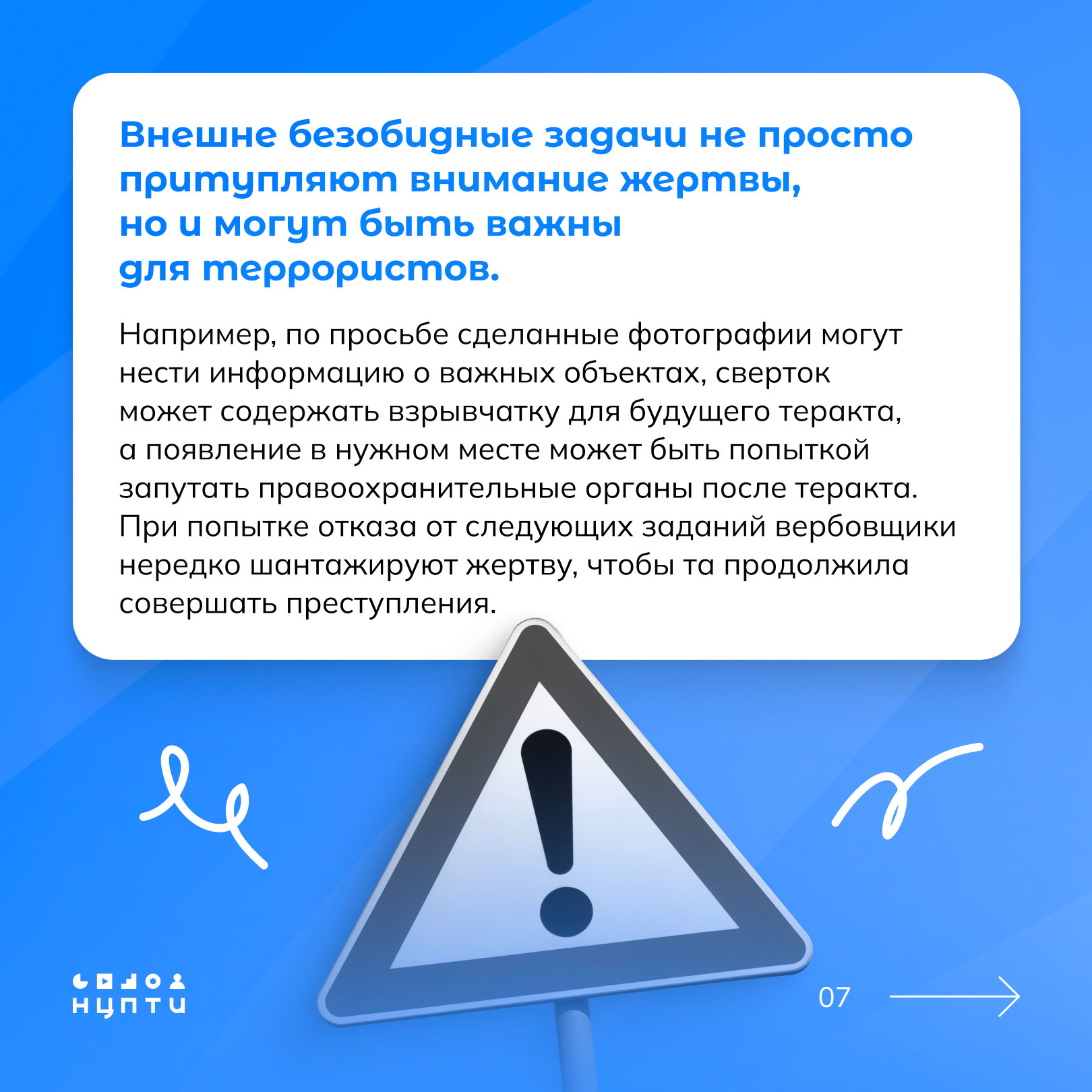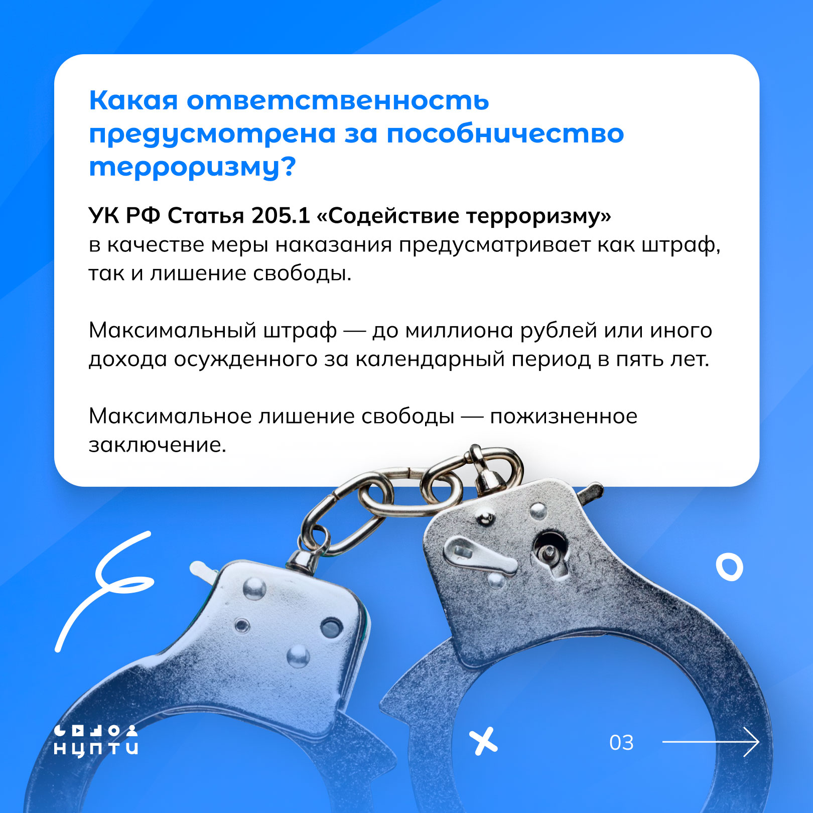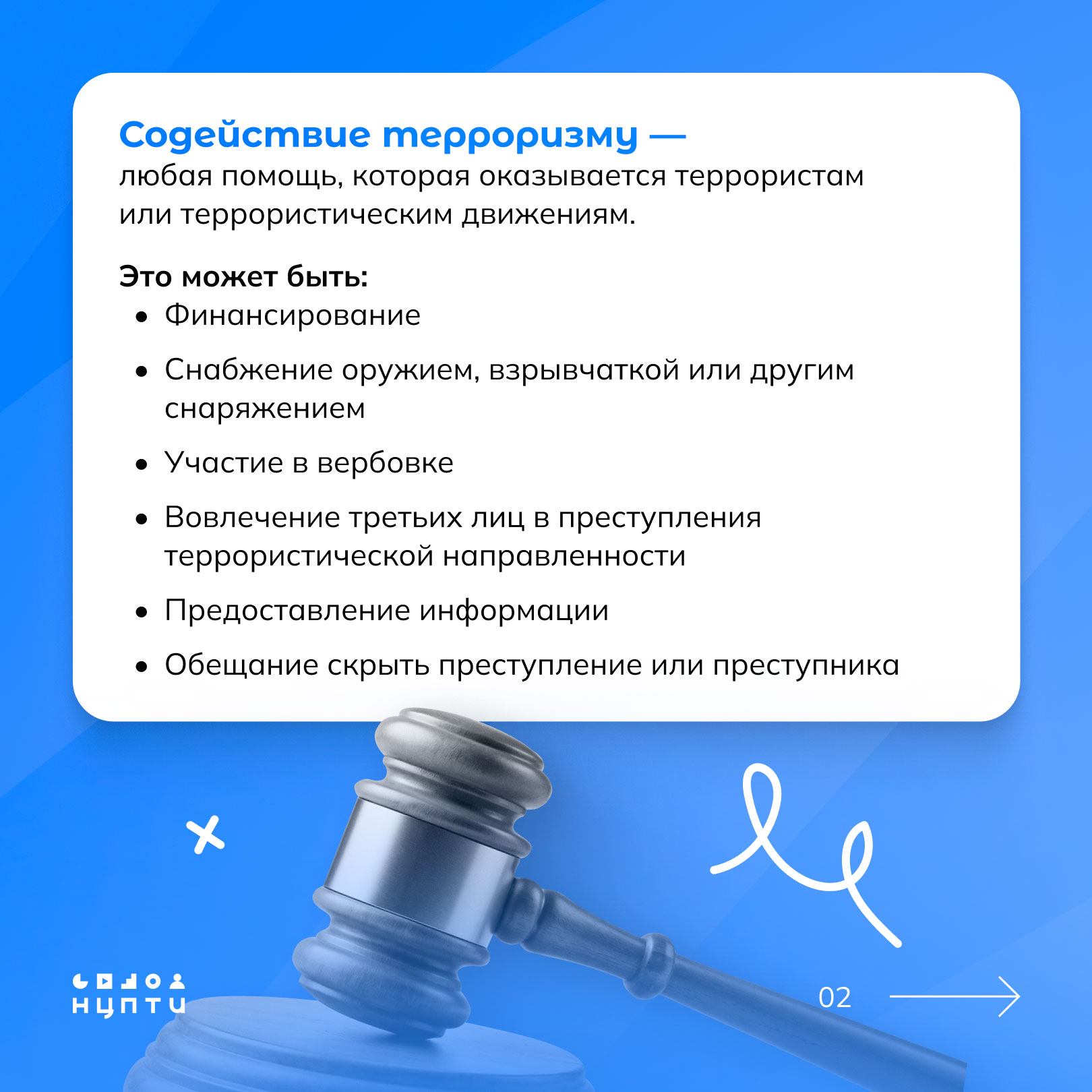 О том, что такое содействие терроризму и какие схемы при этом используются — в карточках, разработанных Национальным центром информационного противодействия терроризму и экстремизму в образовательной среде и сети Интернет (НЦПТИ).